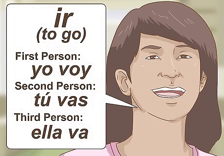 Conjugate the verb ir (pronounced like ear). The Spanish verb ir means to go. When constructing the informal future tense to talk about something that's going to happen in the near future, conjugate this verb in the present indicative to agree with the subject of the sentence. In the first person, ir is voy. In Spanish, "yo voy" means "I am going." If the sentence you are writing is in second person, you would write "tú vas" (too vahs) which means "you are going." For a singular third-person subject, such as él or ella, you would say va, as in "él va" (ell vah) or "ella va" (AY-yah vah). Remember that Spanish has a formal and informal you. Conjugate ir as you would with a third-person subject if you are using the pronoun usted. First-person plural, nosotros (we) is vamos (no-SO-trohs VAH-mohs). Second-person plural, ustedes (you all) is van (oo-STAY-days vahn). With third-person plural, ellos or ellas, ir is conjugated the same. Your readers or listeners will understand the subject from the context of the sentence.