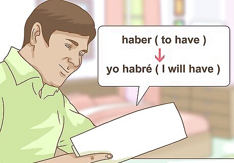 Memorize irregular verbs in future tense. In some Spanish verbs, the spelling of the verb stem changes when you add the ending for simple future tense. About a dozen of these verbs are relatively common verbs that you may find yourself using frequently. Typically, you change the verb stem by adding a consonant to it. For example, when forming the simple future tense of the verb haber (pronounced AH-vair, meaning "to have"), you add an r: yo habré (yo ah-VRAY – I will have). In other irregular verbs, you substitute one consonant for another. For example, for the verb hacer (pronounced AH-sear, meaning "to do or to make"), you exchange the c for an r to make the simple future tense: yo haré (yo ah-RAY – I will make). Find a list of these irregular verbs – there are many available free online from Spanish language websites – and memorize the ones you believe you will use frequently. Return to this list when you encounter a verb you don't know.