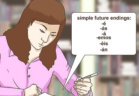 Form the verb in simple future tense. When you conjugate verbs in simple future tense in Spanish, all you have to do is add the correct ending onto the infinitive form of the verb. There's no need to remove the ending to get to the verb stem, as when you conjugate in other tenses. The simple future endings are -é, -ás, -á, -emos, -éis, and -án. The accent mark indicates that you should place emphasis on the last syllable when you say the word. When you add one of these endings to a verb stem, you are saying the same thing in Spanish that you would be saying in English if you said something will happen in the future. For example, take the Spanish infinitive escribir (ess-CREE-veer), meaning to write. You would conjugate this verb in simple future tense as yo escribiré (I will write), tú escribirás (you will write), usted/él/ella excribirá (formal you/he/she will write), nosotros escribiremos (we will write), vosotros escriberéis (you all will write – note that this pronoun is only used in Spain), and ustedes/éllos/ellas escribirán (you all/they will write).