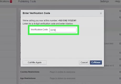 Enter the four digit code. Click the button that says "Call Me Now." Facebook will then call with an automated message giving you a four-digit code. Enter the verification code and hit "continue." Facebook will review your page and email you about whether it was verified in a few days.