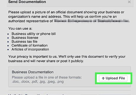 Opt to enter business documents instead. If your website doesn't have a number, or if you'd prefer not to give it out, upload business documents instead. Simply click "Verify this Page with documents instead." You will then be asked to upload public records confirming your business's existence. Public documents may include things like a certificate of owner, a business plan, and other business-related documents.