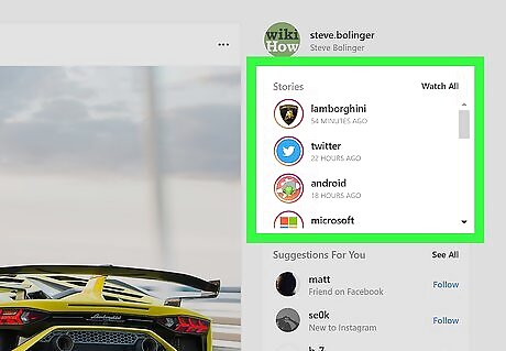 Click on the story you want to view. Stories appear in the "Stories" panel, which you'll find on the right side of your feed. You can click the X at the top of a story to stop watching.