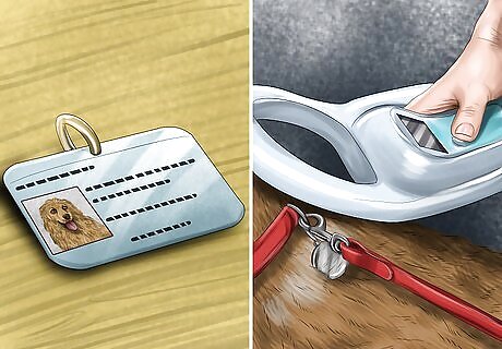 Check your dog's tags. Make sure your dog's tags are up-to-date before taking it out at night. If your dog gets away from you, you'll have a harder time catching it than you would in the daytime. Tags can help ensure your dog is returned safely to you if someone else finds it. Also, it's a good idea to use reflective tags to make your dog more visible. You can also get your dog microchipped. Basically, a small chip is embedded under your dog's skin that provides contact information for places that have readers (generally vet clinics and animal shelters). A microchip remains in place even if your dog loses its collar.