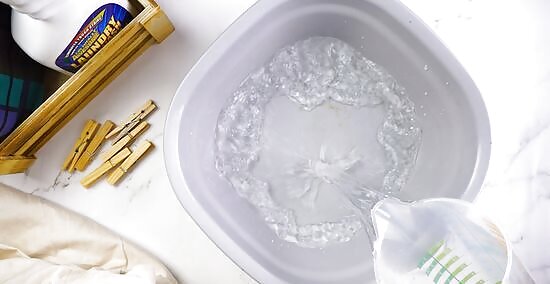 Stir 1 tsp (5 ml) to 1 tbsp (15 ml) of laundry detergent into the water. How much detergent you use will depend on how many sheets you’re washing, but consider using between 1 tsp (4.9 ml) and 1 tbsp (15 ml) of a gentle detergent that’s safe for your fabric. Stir it into the water using a large spoon so it’s evenly distributed.