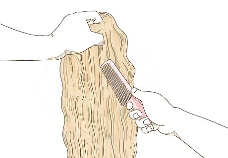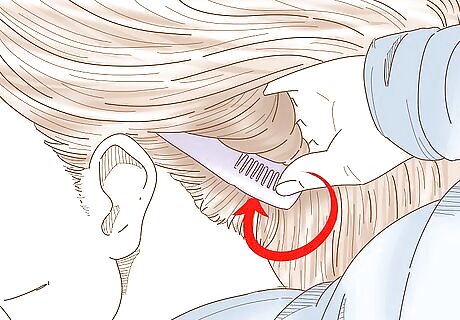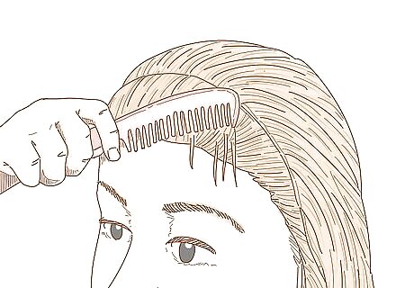 Pull up the front sections of your natural hair with a comb. Take the thin, narrow end of a rat-tail comb and slide it beneath the front portions of natural hair that are visible in front of your half wig. Instead of pulling the hair out completely, use the end of the comb to make the surface of natural hair puff slightly. Are you worried that your natural hair still won’t look like it’s blending with the wig? Don’t worry—take some small, 1 inch (2.5 cm) sections of hair from the back of your half wig and tousle them to the front to balance out the look.