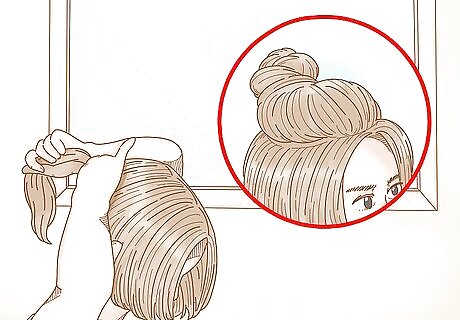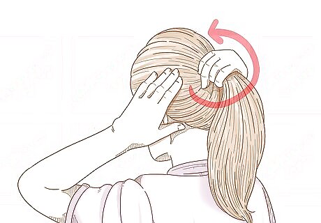 Tie your hair into a ponytail before putting on the wig. Use both hands to take the back sections of your hair and secure them into a high ponytail. Keep in mind that the half wig will still be featuring your natural hair along the front of your head, so the ponytail will be covered on the back. If you have shorter hair, aim for the ponytail to be centered along the back of your head. If you’d prefer for your hair to be more secure, tug a wig cap over the back portions of your hair. When wearing a cap, try tying your hair in a bun instead of a ponytail. If you see any stray hairs, be sure to secure them with bobby pins.