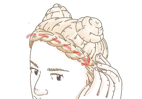 Braid your natural hair down the side of your wig for a chic vibe. Take the front section of your natural hair and braid it normally. Continue the braid down your hairline, and tuck it into place behind your ear with a bobby pin. If you want to keep your hair out of your face, tie the rest of your wig into a side ponytail after you secure the bobby pins into place. If you’d like, you can also test out another style of braid, like a French braid. Create a fun spin on this look by tying the majority of your wig hair into a fun updo!