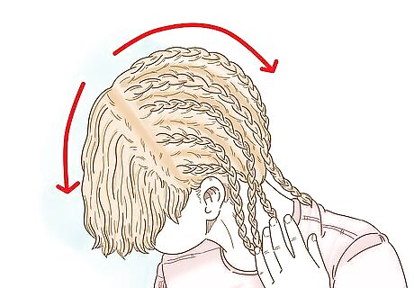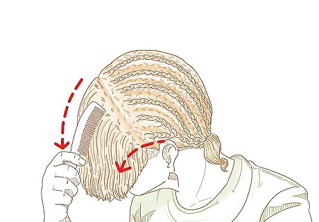 Braid your hair back in rows if your hair is coarse. Separate the front sections of your hair by braiding them horizontally along your forehead. Once these braids are in place, use the edge of a flat comb to continue separating the rest of your hair into 1 inch (2.5 cm) sections. Braid each of these sections backwards, until they reach your lower hairline along the neck. Use hair clips to fold up the lower sections of your braids. This makes it easier to conceal your hair beneath the half wig.