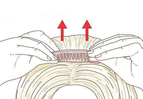 Take the half wig off by gently removing the clips. Use soft, gentle motions to tug the lower comb from your hair, if necessary. Next, delicately tug the larger, upper clip from your natural hair. Make sure that you’ve removed any bobby pins or clips before you proceed with taking off the half wig. When removing a sewn-on wig, carefully feel around the circumference of your head for the threads keeping your wig in place. Use a small pair of scissors to cut through these stitches and loosen the wig.