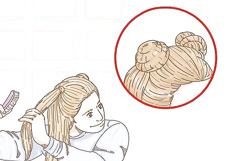 Tie 2 small buns on the top of your head if you’d rather go for a cute look. Take a small portion of both natural and synthetic hair on the right side of your head and tie it in a pigtail. Create an identical pigtail with the natural and synthetic hair on your left side. Once these base pigtails are in place, take each section of hair and twist it in a circular motion, forming a bun. Use 2 hair ties to secure both of these buns into place. Use bobby pins to provide extra security for your hair while tying the buns.