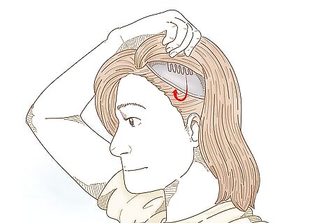 Fasten the wig clips along the edge of your wig cap. Take the wig and place it over the back of your head. If your wig has an especially large clip, use this to initially attach the wig to the edge of your cap. Make sure that the half wig is secured all around the cap, including the sides and bottom. Many half wigs come with clips that help you secure it into place.