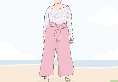 Try wearing a floral top to create a fun, summery outfit. Most paper bag pants are solid-colored. If you want to create a beachy look, put on a floral shirt that incorporates the color of your pants. This will make your outfit seamless and give you a nice defined torso and lower body. Bright colored paper bag pants like pink or fuschia always go well with floral tops. A floral top, paper bag pants, strappy sandals, and a large hat is a great look for the beach.