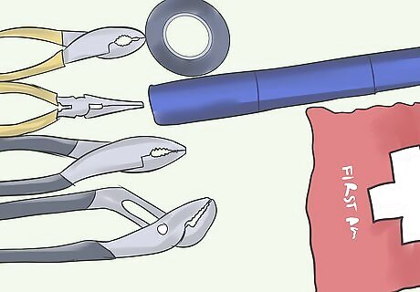 Put together an emergency kit and keep it in your trunk. It's a very good idea to keep an emergency kit in your car in case it breaks down and you get stranded in bad weather conditions. The kit should include: boots, gloves, hats, some wool blankets, ice scrapers, defroster, a flashlight, salt or cat litter, jumper cables, a first-aid kit, some flares, bottles of coolant and washer fluid, and a radio. You should also include some non-perishable snacks (like unsalted canned nuts and dried fruit) and a bottle of water. Even if the water freezes, you can thaw it out or eat the ice in order to stay hydrated. You should also keep a phone charger in the car for your cell phone.