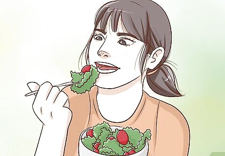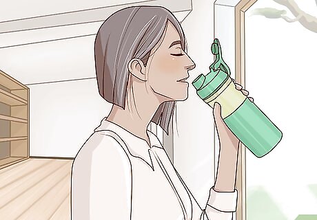 Stay hydrated while you work. Getting the fluids you need will help you feel more focused and awake. Bring a water bottle with you to work so that you can refill it whenever you need a drink, and take frequent sips throughout your shift.Tip: You can hydrate yourself with other beverages, but water is usually the healthiest choice. If you don’t like the taste of water by itself, try adding a splash of lemon or lime juice. You can also get fluids from hydrating foods, like soup, fruit, or vegetables.