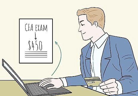 Pass the tests to become a CFA. Register for the tests online when you’ve met all the requirements. You must also have an international travel passport and live in a participating country. Go to the CFA Institute website to register for your first exam. You will have to make a one-time payment of $450 for the program enrollment fee, then pay an additional sum to take the test itself. There is an early, standard, and late registration fee. To save a few hundred dollars, pay the early registration fee before the deadline. For example, if you plan on taking the first test in June 2020, you’ll need to pay the $650 early registration fee by mid-October 2019. The standard fee is $950 and is due about 4 months before the test. The late registration fee is $1,380 and is due about 3 months before the test. The registration fee covers the curriculum you’ll study to get ready for the test and the practice tests you’ll have to take to prepare for the exam.