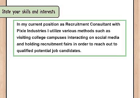 State your skills and interests. After letting the recruiter know what kind of job you're looking for, you have to demonstrate why you would be qualified for that particular job. In a new paragraph mention all of your relevant experience, and why that would make you good at the job you're seeking. Remember that this section shouldn't just restate your resume; the recruiter already has your resume. What it should do is elaborate on some points that don't get fully covered on your resume. For example, you may have done an internship for a semester. This is only one line on your resume, but you can elaborate on how it gave you invaluable skills and experience for the job you're seeking. You can also bring up experience that isn't on your resume. For example, tutoring your neighbor might not be suitable for a resume, but you can mention how this experience gave you a sense of responsibility, which will help you in the job you're seeking.