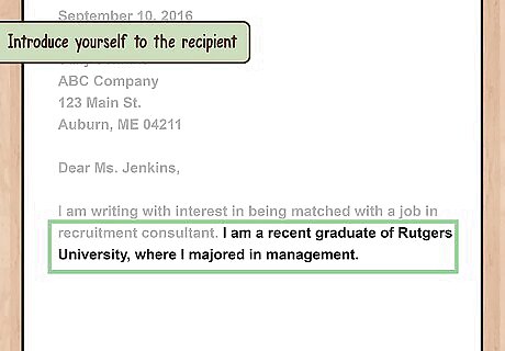 Introduce yourself to the recipient. After the first sentence, within the first paragraph, you should give a very brief introduction of yourself. This shouldn't go longer than two sentences; just give the recipient an idea of who you are. A good introduction would be: "I am a recent graduate of Rutgers University, where I majored in management."