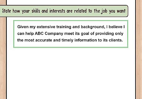 State how your skills and interests are related to the job you want. Remember, the point of this letter is to show the recruiter that you're a good fit for the job you want. Therefore it's not enough to just state your skills. You also have to show why these skills and experiences will make you a good job candidate. Look at the transferable skills you've attained. For example, if you're looking for a job in sales, you might not think your stock worker position at a retail store gave you much experience. But if you dealt with customers, that means you've gained customer service experience. These skills easily transfer over to dealing with potential clients for your company. If you've never had a job, things you've done in school can also be applicable. You might have given a classroom presentation. That means you have public speaking experience. Other classroom experience that gives you job skills are the ability to meet deadlines, multitask, and work under pressure.