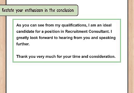 Restate your enthusiasm in the conclusion. After stating all of your relevant experience, start a concluding paragraph. In this paragraph, you should reiterate your job preference and that you are a qualified candidate. Also thank the recipient for his or her time in considering your application. Your closing should sound something like this: "As you can see from my qualifications, I am an ideal candidate for a position in sales and marketing. I greatly look forward to hearing from you and speaking further. Thank you very much for your time and consideration."