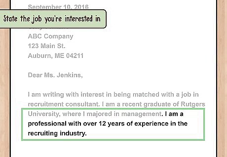 State the job you're interested in. Since the recruitment consultant will match you with a job based on your cover letter and resume, you should state if there is a specific job or company you're interested in being matched with. That way, the recruiter will know what you're looking for and be better equipped to help you find a job. Recruiters may or may not advertise the companies that they work with. If the recruiter you're writing to has made this information public, mention the specific companies you're interested in working for. This demonstrates that you're a serious candidate who has done research into the job you want.