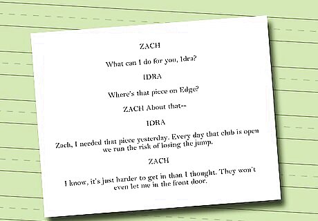Write your first draft. Make sure your dialog is very colloquial (characteristic of or appropriate to ordinary or familiar conversation rather than formal speech or writing). An exercise in helping write colloquial is to eavesdrop on someone else's conversation and record it word for word.