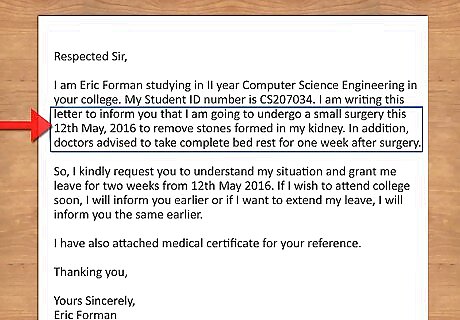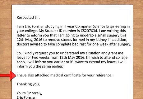 Write a leave of absence letter as supporting documentation. The leave of absence request should generally be accompanied by supporting documents that your university will need in order to approve your request. If you are requesting military leave, you will have to attach your military orders. If you are requesting leave for medical reasons, you will have to attach a letter written by your doctor or health-care provider. If, however, you are requesting leave for personal reasons, you will have to write a leave of absence letter explaining the circumstances and reasons for your request.