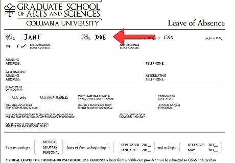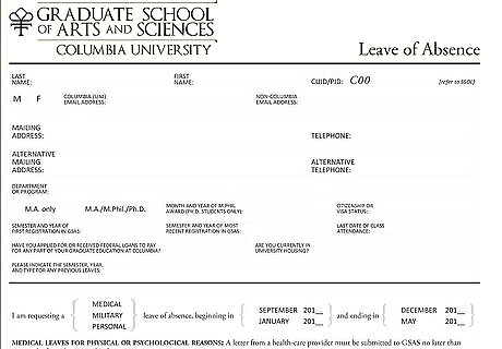 Locate a leave of absence form. Students seeking a leave of absence from their university are generally required to fill out a form. Download a leave of absence form provided by your university department on its website. These forms should also be available at your departmental office.