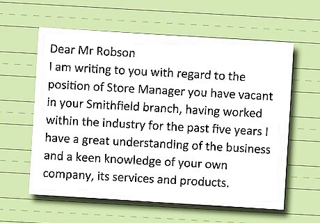 Write the opening paragraph. The opening paragraph is an opportunity to indicate which position you are interested in and how you heard about it. If you were referred by a friend who works for the company, stating this in the first paragraph might establish an instant connection for the hiring personnel. Include 1 or 2 sentences explaining your appreciation of the company's products or services. If you are not familiar with the company, research it so you can elaborate on your desire to join the management team.