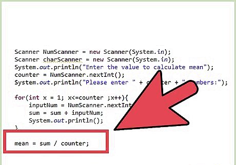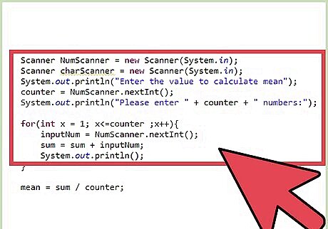 Write the code. To calculate the mean, you'll need the following parameters: The sum of all the inputs provided by the user; and, The total number of inputs provided by the user. For example, if the sum of the inputs = 100, and the total number of inputs = 10, the mean = 100 / 10 = 10 Therefore, the formula to calculate the mean, or the average, is:Mean = Sum of all inputs / Total Number of inputs To get these parameters (inputs) from the user, try using the Scanner function in Java. You'll need to get multiple inputs from the user for each of the terms you want to find the mean of. Try using a loop for this. In the sample code below, a for loop is used. You can try using a while loop too.