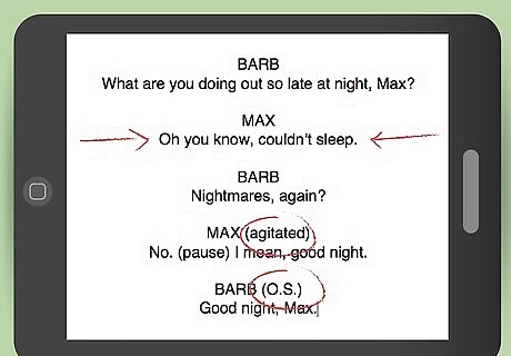 Format the dialogue properly. The dialogue should appear properly formatted in your screenplay, especially as you will likely have a lot of dialogue and it should appear right every time. You should place the name of the character who is speaking above the dialogue and then have the dialogue appear below the character’s name. Make sure the name of the dialogue always has a left margin of 2.7” and a right margin of 2.4”. It should not be flush to the left or right margin of the page and should appear more in the center of the page. You should also include any notes on the attitude or demeanor of the character’s dialogue in parentheses underneath their name. Avoid including too many parenthetical notes in the dialogue and only use it when necessary. Try to limit the use of parenthetical notes to one time per scene. You may also extensions, which should be placed in parenthesis next to the character’s name. Extensions let the reader know how the character’s voice will appear on screen. Your character’s voice may be heard off screen (O.S.) or as a voice over (V.O.). For example, the dialogue in your screenplay may appear as:BARBWhat are you doing out so late at night, Max?MAXOh you know, couldn’t sleep.BARBNightmares, again?MAX(agitated) No. (pause) I mean, good night.BARB (O.S.)Good night, Max.