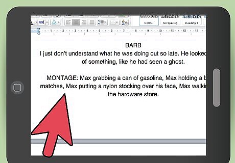 Add in shot notes. You should include notes on how a shot will look on screen, especially if you feel it is important how the shot appears and want to notate this to your reader. Rather than include shot notes for every line of dialogue or throughout every scene, pick key moments in a scene to include a shot note. Common shot notes include “CLOSE UP” or “TIGHT ON”, which indicates a close up on a person or object on screen. For example: “CLOSE UP on Max’s face.” If someone or something is going to be inserted into an ongoing scene, you may put in an "INTERCUT." Notate the intercut on its own line to the left margin of the page and then specify what is being inserted. For example, "INTERCUT PHONE CONVERSATION." You may also note if there is going to be a montage on screen. A montage is a series of images that reflect a theme, contradiction, or passage of time. Notate a montage with the word “MONTAGE” and then a list of the images in the montage. For example, “MONTAGE: Max grabbing a can of gasoline, Max holding a box of matches, Max putting a nylon stocking over his face, Max walking up to the hardware store.” You can also notate if you are going to use a tracking shot to follow a person or an object on screen. You may write “TRACKING SHOT” and then have a brief action line explaining the shot. For example, “TRACKING SHOT: Max walks up to the hardware store with the can of gasoline and the matches.”