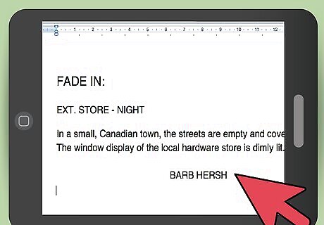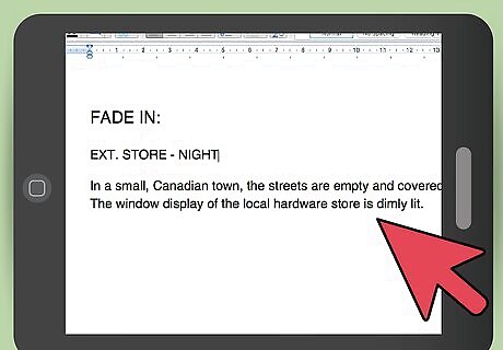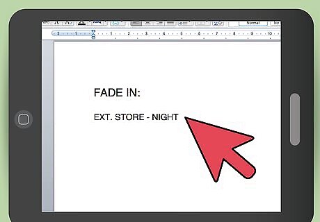 Begin every scene with a scene heading. The next item on the page should be a scene heading, also known as a slugline, which is a one-line description of the location and time of day of a scene. If the scene takes place indoors, you would have the heading: “INT.”, short for “interior.” If the scene takes place outdoors, you would have the heading “EXT.”, short for exterior. The scene heading should also indicate the location of the scene, such as “LIVING ROOM” or “HARDWARE STORE” and the time of day, such as “DAY” or “NIGHT.” Make sure the scene headings always appear in all capitals, flush to the left margin of the page. You should always have a scene heading at the beginning of every new scene in your screenplay so the reader knows where they are. For example, if your scene is outdoors at night in front of a hardware store, your scene heading would be: “EXT. HARDWARE STORE - NIGHT.”