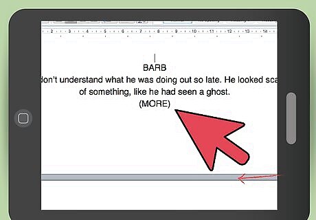 Indicate when dialogue is continuing to the next page. If a character’s dialogue continues onto the next page, you should indicate this in the screenplay. You may place the word “MORE” or “CONTINUED” in parentheses underneath the dialogue so it is clear that the dialogue is not done and continues on the following page. For example, your dialogue may appear as:BARBI just don’t understand what he was doing out so late. He looked scared of something, like he had seen a ghost.(MORE)
