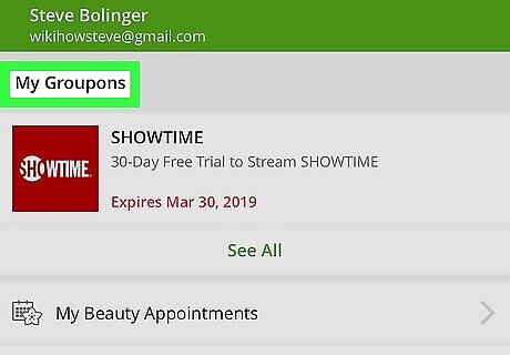 Tap My Groupons at the top of the menu. This option is listed next to a price tag icon at the top of the My Stuff menu. You can find all your past deals and coupons here.