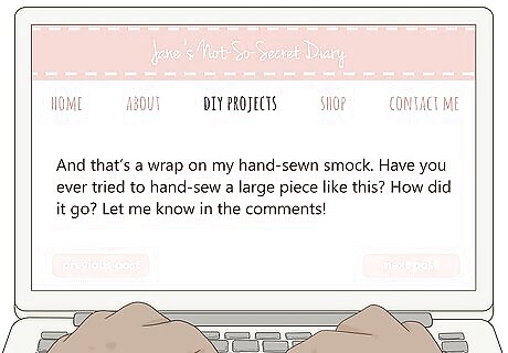Engage your readers by asking questions or requesting tips. Most of the people who read your blog are also interested in sewing. At the end of your post, ask your readers to chime in with their thoughts and opinions about your new blog post. If your project didn’t go well, you can ask your readers for experiences they’ve had or what they might have done differently. An example of this might be, “And that’s a wrap on my hand-sewn smock. Have you ever tried to hand-sew a large piece like this? How did it go? Let me know in the comments!” Try to reply to as many comments as you can to let your readers know that you have seen them.