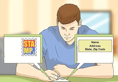 Apply your return address label and stamp. The return address label belongs in the top left-hand corner of the front of the envelope. In the top right-hand corner is where you should stick the stamp.