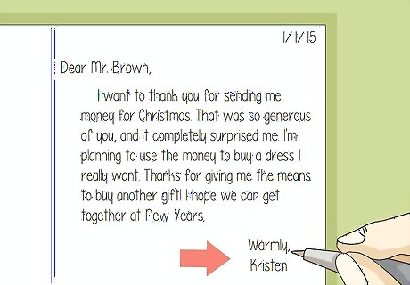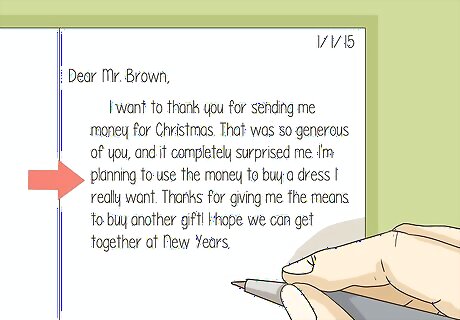 Write your thank you message. As you are thanking someone for giving you money, it is important to thank them for their generosity and/or thoughtfulness, express your gratitude, explain how you will use or save the money, and continue your connection with the recipient. “Thank you for the money that you gave me for graduation. I'm so thankful that you made this investment in my future. I'll be putting the money into my savings account to cover college expenses. I'll be home for Thanksgiving, so I hope to see you then.” “I want to thank you for sending me money for Christmas. That was so generous of you, and it completely surprised me. I'm planning to use the money to buy a dress I really want. Thanks for giving me the means to buy another gift! I hope we can get together at New Years.” “There just aren't enough words to express how thankful I am for the money you sent me. I've been in a tight spot for a while now, and the money you unexpectedly sent me will help so much in covering some expenses I have right now. I'm so grateful to have someone like you in my life. I'm planning to host a small dinner party in a few weeks, and I'd love it if you could attend.” “We want to send our sincerest thanks for the money you thoughtfully gave us as a wedding gift. We are saving to buy our first home, so we will contribute this money to that savings fund. Thank you for helping us get one step closer to our goal! We'll let you know when we accomplish it.”