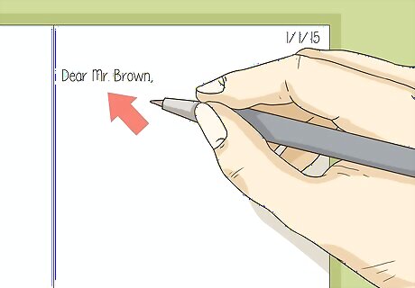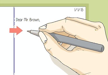 Write the greeting just below the date but on the left-hand side. Shift your hand down just a bit from where you wrote the date, and then slide your hand across to the left side. Here is where you should write your greeting. The formality of it will vary depending on who your recipient is; a friend or family member can have a less formal greeting, while a boss, donor, or other important person would need a more formal one. “Dear Susie,” “Dear Mr. Brown,” “Dear Mr. and Mrs. Thomas,” “Hi Jonathan,” “Hey Michelle!” “Hello Mrs. Smith,”
