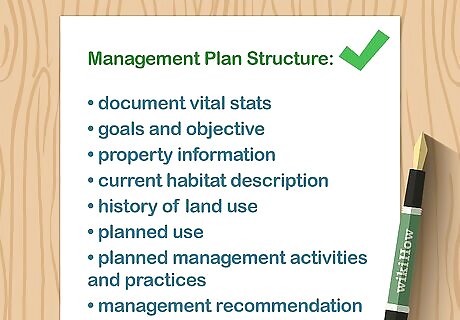 Lay out your clear, realistic management objectives. In most cases, WMPs seek to increase, decrease, or maintain the numbers of one or multiple wildlife species currently on the property, or to reintroduce a native species. However, generic goals like “increase the numbers of birds and deer” won’t do—set specific goals that are achievable based on the circumstances. For instance, in bullet-point form, you might write: “Increase the native blue jay population in the wooded areas of the property by improving their preferred habitat conditions.” “Reintroduce white-tailed deer to the property by transforming the current agricultural areas.” “Eliminate non-native, invasive fish species from the pond at the center of the property.”