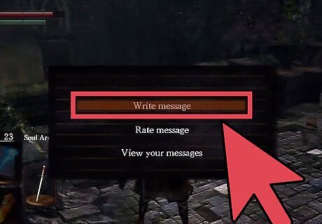 Select "Write Message" to write your own message on the ground. You will have options of what to write, such as "Be wary of..." or "Try...". Select an opening statement and you can then select how to finish it, for example "Be wary of... tough enemy" or "Try luring it out".