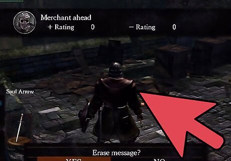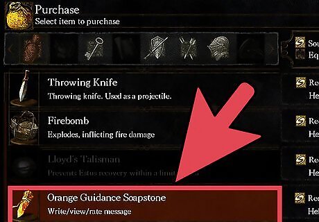 Obtain the Orange Guidance Soapstone. The stone can be purchased from the Undead Male Trader in Undead Burg for 100 souls. The trader can be found near the bonfire in Undeadsburg, underneath the two spear Hollows and sniper, before you reach the area with the firebombing Hollows. Break the boxes after defeating the spearmen and go down the stairs, where you find the merchant near the bottom.
