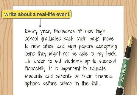 Write about a real-life event that you can connect to what you’ve learned in school. One of the main goals of academic reflective writing is to connect what you’ve been experiencing with what you’ve been learning, because this makes your learning concrete, useful, and memorable. Ask yourself if your observations are consistent with academic models, if the theories help you interpret your evidence, or if your real life experience contradicts what you’ve been learning in class. For example, if you’ve been learning about how kids develop and you’ve been doing a lot of babysitting, think about whether the kid’s actions line up with what you would expect from your studies. It doesn’t have to be a major new experience. Something as simple as going to the grocery store or the gym can work, as long as you can relate it to what you’ve been learning.
