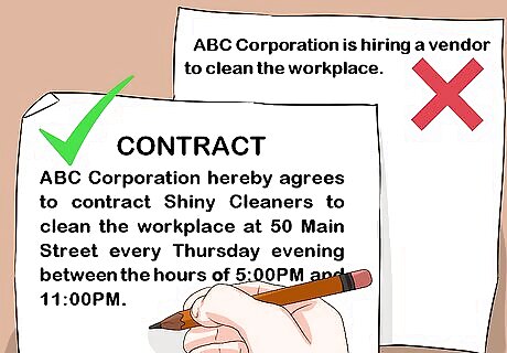 Use clear, specific details. Be sure that the terms of the contract are clear, so that everyone involved understands the terms, and specific, so that the contract spells out exactly what is being contracted. For example, the following statement is too vague for a contract: “ABC Corporation is hiring a vendor to clean the workplace.” More specific would be: “ABC Corporation hereby agrees to contract Shiny Cleaners to clean the workplace at 50 Main Street every Thursday evening between the hours of 5:00PM and 11:00PM.”