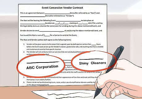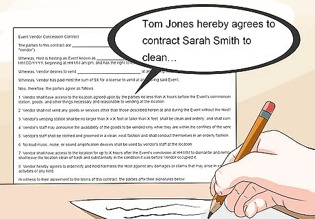 Identify the parties involved. The parties to the contract should be explicitly named in the contract. This may mean the full legal names of the parties involved, or it could mean the official business name of the employing company and the vendor. For example, your contract may say, “Tom Jones hereby agrees to contract Sarah Smith to clean…” or it might say “ABC Corporation hereby agrees to contract Shiny Cleaners to clean…”