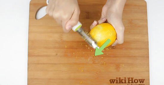 Drag the zester along the outside of the citrus. Run the zester lengthwise across the outside of the fruit using short, quick strokes. For best results, hold the fruit away from your body and pull the zester towards you. When forced through the tiny holes of the zester, the peel will curl into thin ribbons, perfect for garnishing desserts or placing around the rim of a cocktail. Position the zester over a cutting board, plate or paper towel to keep the zest shavings together. Only grate the brightest part of the citrus, and stop before you reach the bitter pith.