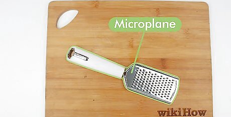 Set out a large plate or cutting board. Zesting can get a little messy if you’re not careful. A cutting board or similar surface will help stabilize the microplane while also collecting the loose zest. Make sure you keep the microplane centered over the surface as you work. A shallow bowl will also work, especially if you’re using a small handheld microplane. If you don’t have another suitable surface on hand, lay down a layer of folded paper towels.