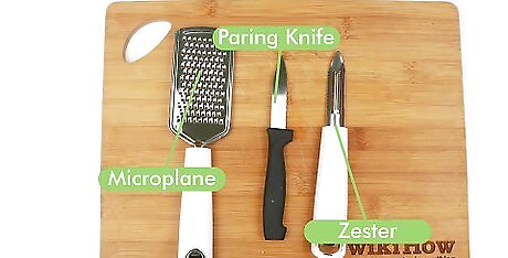 Choose the right tool for the job. Graters, peelers, and paring knives will perform the same basic function, but one may produce a zest that’s better suited to your culinary needs than the other. A microplane grater is the way to go if you want a finely shredded zest that blends seamlessly into sauces, desserts, and other recipes. With a peeler, you’ll end up with slivers of a uniform size and thickness. Slicing citrus fruits by hand will result in an irregularly shaped peel, but offer you more control over the depth of your cut. Any knife with a short, sharp blade will work just fine when you don’t have a more expedient zesting tool on hand. When using a peeler or paring knife, you’ll need to go back and chop the peel to an appropriate size later on.