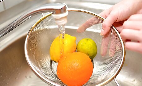 Wash the citrus. Before you get started, run the fruit under a stream of cool water, then buff it gently with a clean cloth or paper towel. A light rinse will help remove the natural waxy residue on the outside of the fruit. You can also give the citrus a quick soak in a shallow bowl of water. It’s important to wash citrus fruit any time you’re zesting, since the outside is the part that will actually be going into your food. Be sure to remove any stickers or labels so they that don't end up in the zest. Organic fruits are better, but should still be rinsed to ensure cleanliness.
