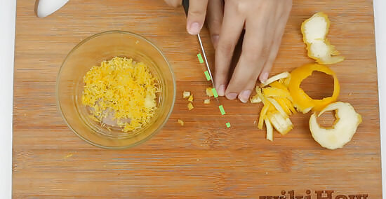 Finish cutting the peel by hand. After peeling the citrus, you’ll be left with a pile of strips of varying sizes. These strips might be a little too unwieldy as-is, but you can easily reduce them to a more usable size by chopping them with a sharp knife. Add the zest to drinks, dinner or dessert while it’s still fresh to get the most out of the potent oils. Slice the strips into long, thin slivers for garnishes, pastry fillings, stir fries, and anything else where you want to highlight the bold flavor of the citrus. Try kicking up the taste of salad dressings, remoulade, and aiolis with a hint of fresh citrus zest.