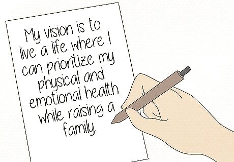 Identifying your core values can help you envision your future. Take a moment to write down your hopes, dreams, and goals—what do you want to accomplish in life? Now, hang this paper somewhere you’ll always see it (like on the fridge or above your bed). Use this simple statement as a reminder to work towards your goals and discover your life’s purpose. A personal vision statement describes your values, strengths, and goals. Know that your purpose or statement doesn’t have to revolve around one thing—it’s not absolute! Your statement can explore multiple interests, passions, or dreams. Your personal vision statement could say something like, “I envision a future where I’m a successful entrepreneur with my own business,” “My vision is to live a life where I can prioritize my physical and emotional health while raising a family,” or “I want to become a successful writer and move out of my parent’s house.” Not sure what your values or goals are? That’s okay! Ask a friend to describe you, or take some time to clear your head by meditating or going on a nature walk. Reader Poll: We asked 255 wikiHow readers, and 50% of them agreed that they like to prioritize personal growth and self-improvement the most when setting personal goals. [Take Poll]